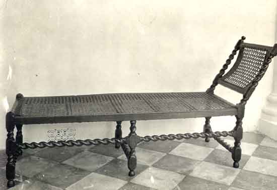 | dc.description.abstract | Photograph depicting a late 17th century Jacobean-style day bed from Groote Schuur. The legs and rails are barley sugar turned, and the head and seat are caned. See also description on p. 18, and Fig. 27 on p. 23 of the 1960 edition of "Eighteenth Century Furniture in South Africa" by G. E. Pearse. | en_US |