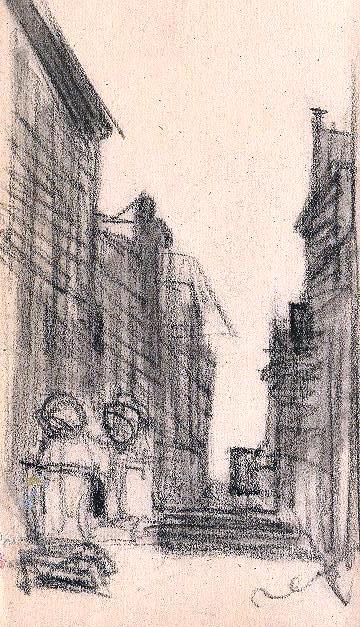 Charcoal sketch by Reus of a street leading to a house with two pillars between buildings on the street.