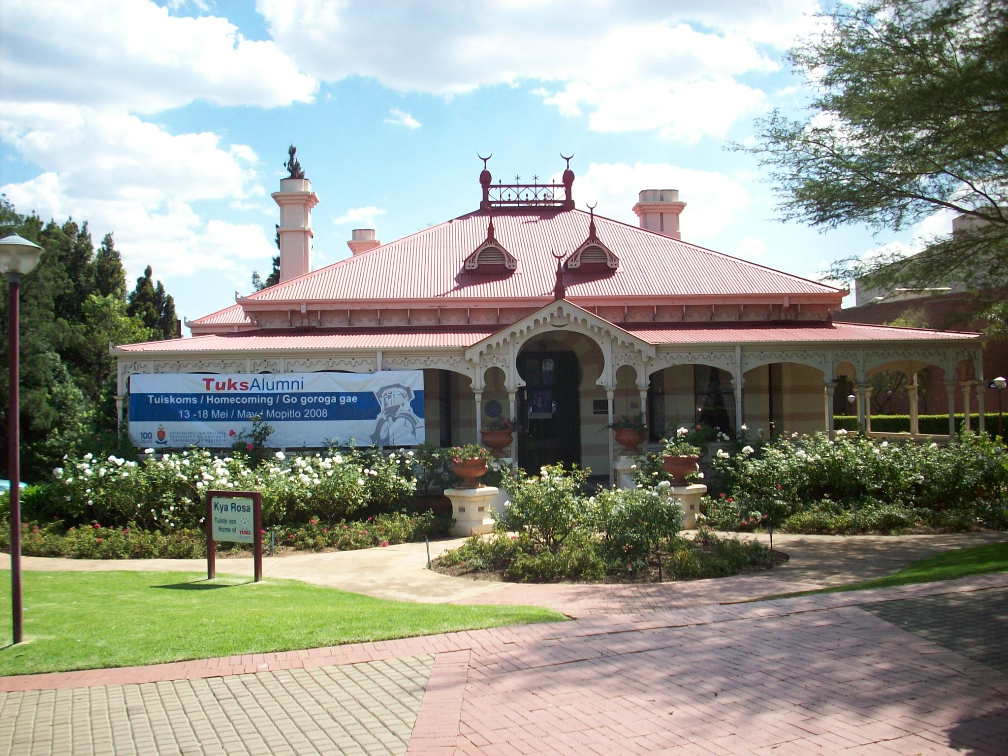 This beautifully decorated late-Victorian house at the main entrance to the University of Pretoria has a fascinating history. The original building was constructed in Skinner Street in 1895 and belonged to Leo Weinthal, owner of The Press (forerunner of Pretoria News). It was named after his wife, Rosa. The word ‘Kya’ is the Zulu word for ‘house’. Kya Rosa later became the first home of the then Transvaal University College (TUC) – the predecessor of UP – but by 1915 it was no longer in use. In 1980, the University commissioned the construction of a replica of the house where it stands today – at the Roper Street entrance to the University. Work began in 1983, under the guidance of architect Albrecht Holm, an alumnus of UP. Precise measurements were taken from the original building and old photographs were used as reference to ensure that the reconstructed building closely resembles the original house. Many of the original Victorian fittings were used in the reconstruction. Today Kya Rosa houses the Office for Alumni Relations and incorporates a small conference and entertainment centre. The house was officially opened by Dr Anton Rupert on 25 October 1985.