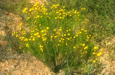 BOTANICAL DESCRIPTION: General: A soft, dense, perennial woody shrublet about 100 - 600 mm high with a rounded form, 60 - 400 mm in diameter. It is an extremely active invader, which flourishes on overgrazed veld. Leaves: The numerous hairless leaves are small, narrowly linear, somewhat sticky and arranged alternately on the stems. They taste bitter, hence the common name. Flowers: At the end of almost every branchlet there is a small yellow flower head. It is ±10 mm in diameter and without ray florets.