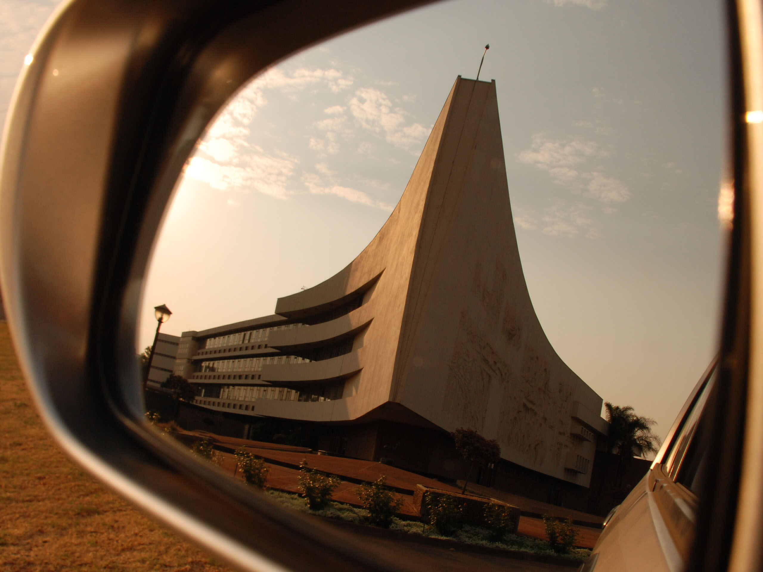 View of the reflection of the Administration Building from a cars side mirror, Hatfield Campus, University of Pretoria.