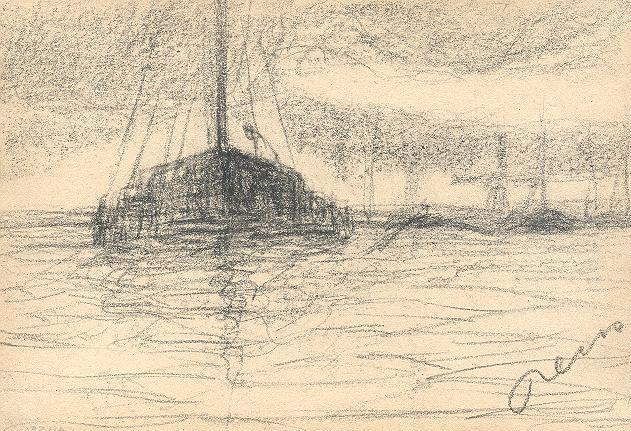 Two charcoal sketches depicting a large sailing barge on the Oude Maas river in Dordrecht in the Netherlands with several other ships and a windmill in the background. On the back is an incomplete drawing of a cow.