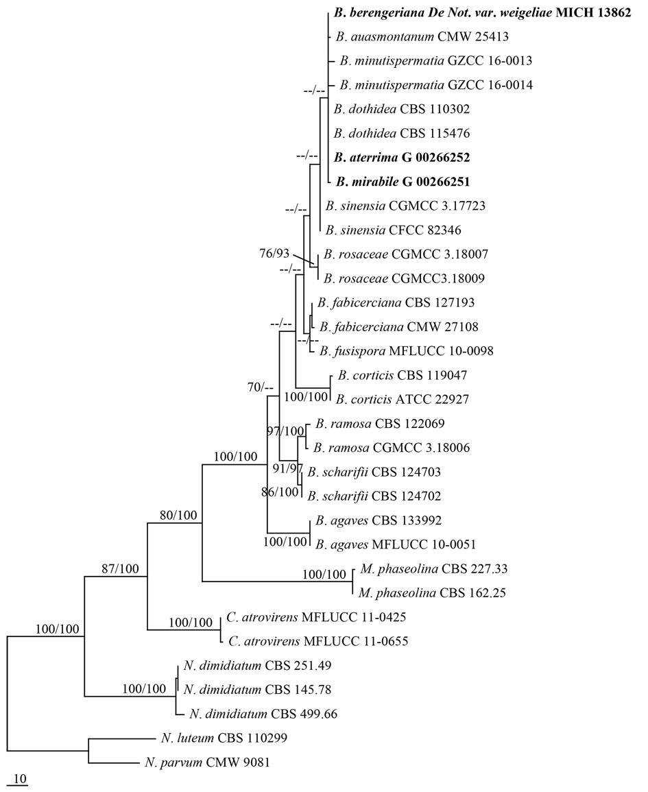 Botryosphaeria mirabile is confirmed in Botryosphaeria. Botryosphaeria berengeriana