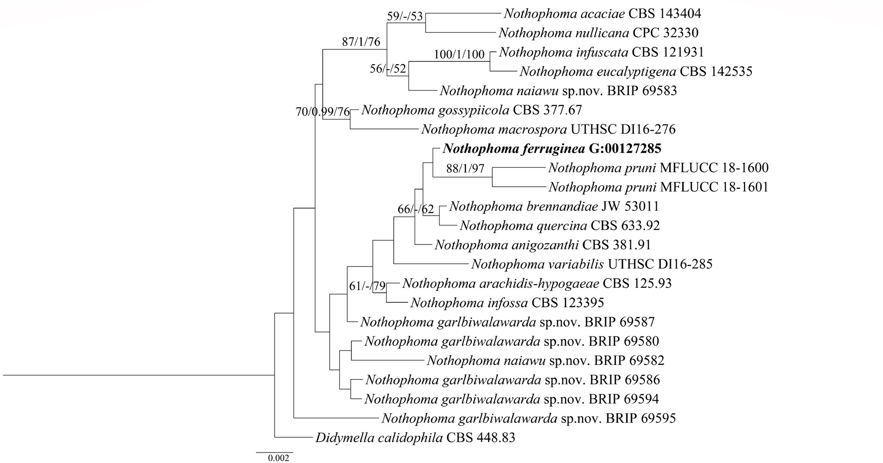 Supplementary Figure 7 | One of the most parsimonious trees obtained from ITS and LSU sequence dataset of Nothophoma spp. Outgroup taxa is Didymella calidophila. Maximum likelihood (ML) support values above 50%, Maximum parsimony (MP) support values above 50%, and Bayesian posterior probabilities (PP) support above 95% are shown with ML and MP bootstrap followed by Bayesian PP (MP/PP/ML) values at the nodes. The species characterized in this study are in boldface.