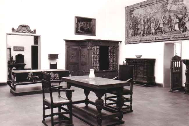Photograph of a 17th century interior at the Rijksmuseum, Amsterdam. It features several pieces of furniture, including a built-in bed, chest, chairs, table and cupboard.