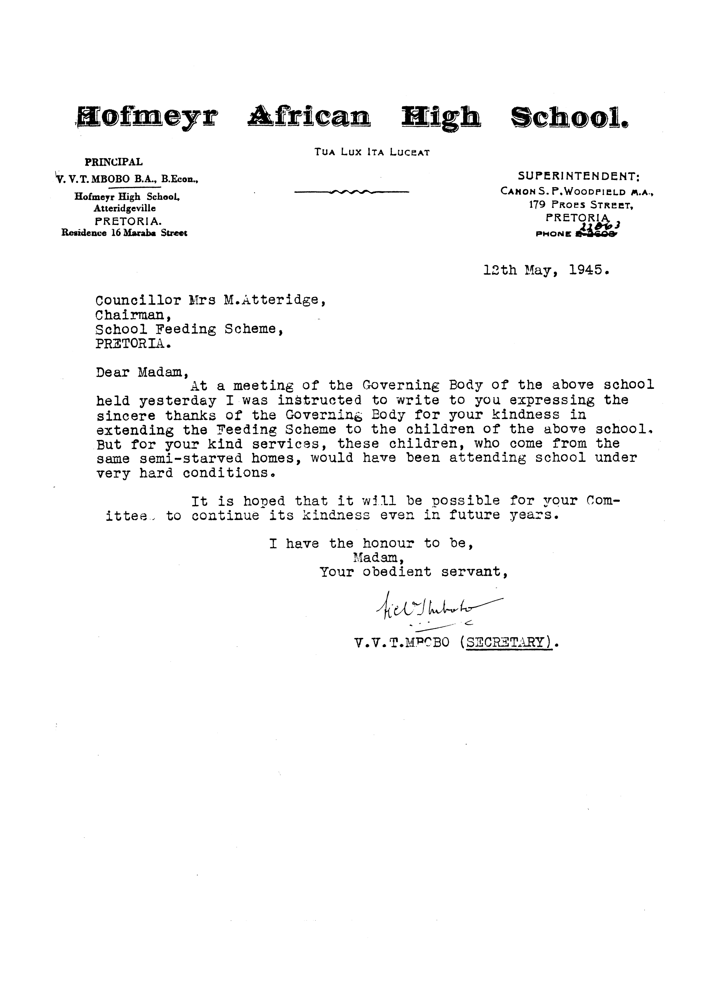 | dc.description | A letter from V.V.T. Mbobo, principal of Hofmeyr African High School, writing to Mrs M. Atteridge on the behalf of the Governing Body showing gratitude towards her work. | en_ZA |