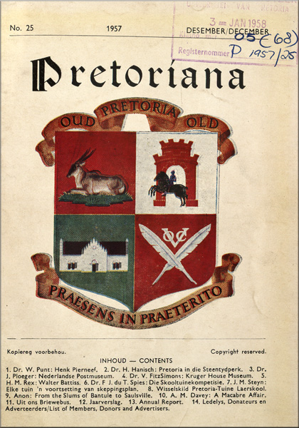 Henk Pierneef -- Pretoria in die Steentydperk -- Een en ander aangaande die Nederlandse Posmuseum in Den Haag -- A short history of the Kruger House Museum, Pretoria -- Walter Battiss se sesjarige verblyf in Rustenburg (1923-1929) -- Die skooltuinkompetisie -- From the slums of Bantule to Saulsville -- A macabre affair -- Uit ons briewebus -- Annual report 1957Association Old Pretoria list of members