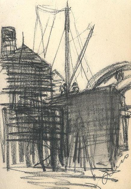 Charcoal sketch by Reus of a ship with two figures next to a dock in Dordrecht. To the left is a warehouse and a suspension bridge can be seen in the background.