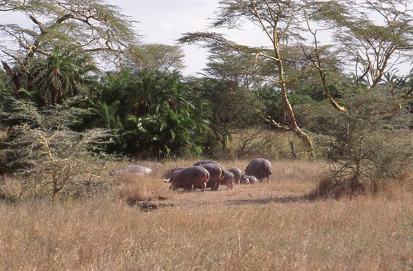 Hippopotamuses and fever trees, Serengeti National Park, Tanzania - July 1996
