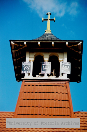 Politieke party plakkate aangebring aan kloktoring van Tukkiewerf, die voormalige broederswoning van Christian Brothers College.
