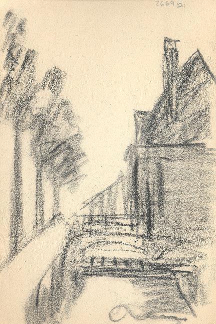 Charcoal drawing of two small bridges over a river with a large building to the right and three trees to the left, signed at the bottom. On the back is the incomplete sketch of a woman sitting on a bench.