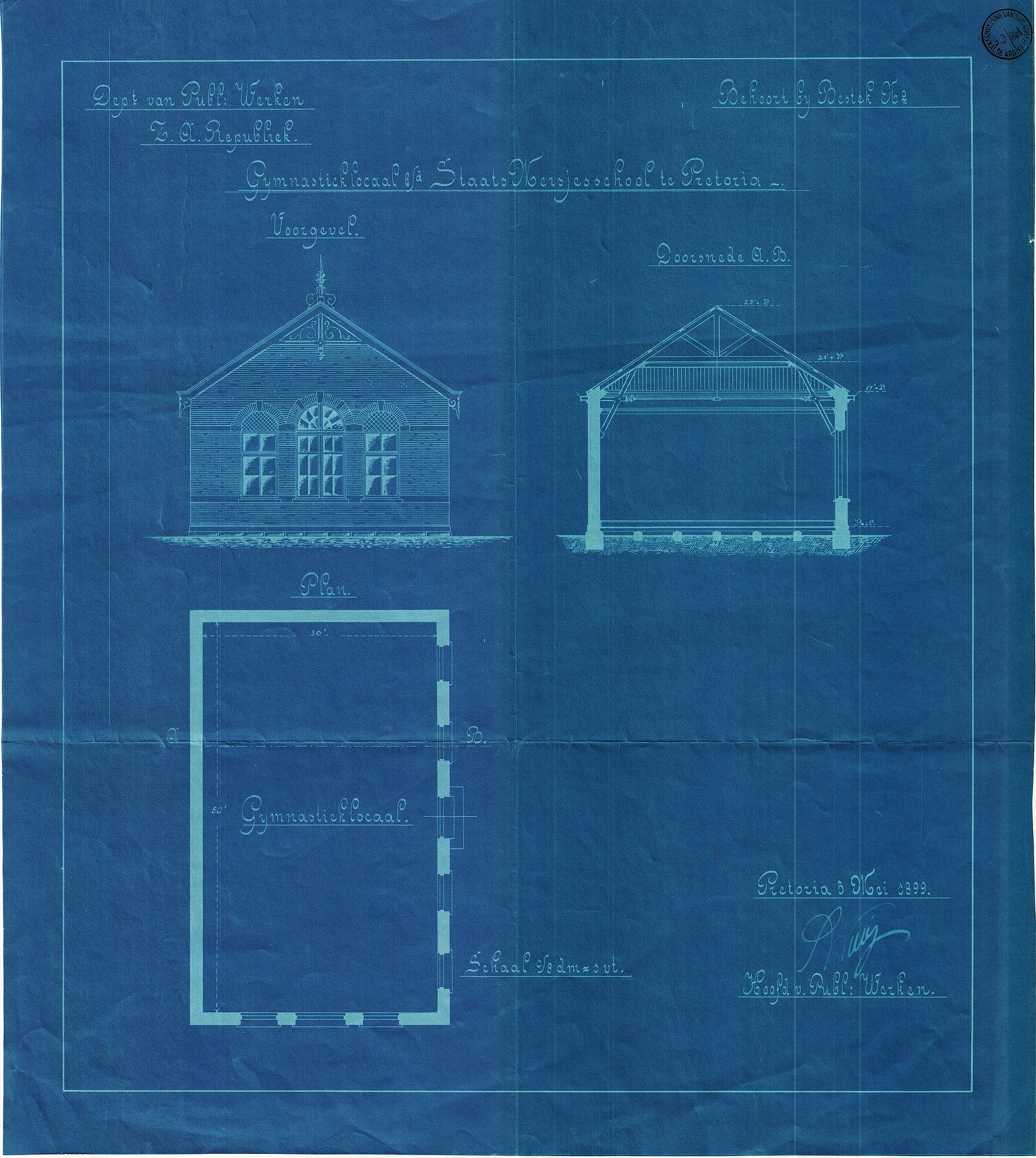 Digitised version of National Archive file S.3/861. Drawings: "Voorgevel, Doorsnede, Plan" (Front Gable, Section, Plan), Gymnastics Hall, Staats Meisjeschool, Pretoria, signed by "S.W. Wierda, Hoofd van Publ.Werken"