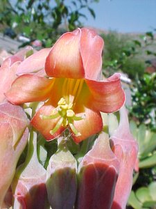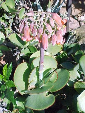 BOTANICAL DESCRIPTION: General: This is a succulent perennial plant, which grows between 50cm and 1 metre high when in flower. It has thick stems that root everywhere where they touch the soil. Leaves: The fleshy leaves vary greatly in size and shape, from broadly ovate to oblong to lanceolate. They are covered with a thin waxy bloom and usually pale blue-green with red-rimmed margins. Flowers: The waxy tubular flowers, carried in a terminal inflorescence, vary in colour from light orange to pink, but are usually coral-red, and pendulous. All flower parts in fives.