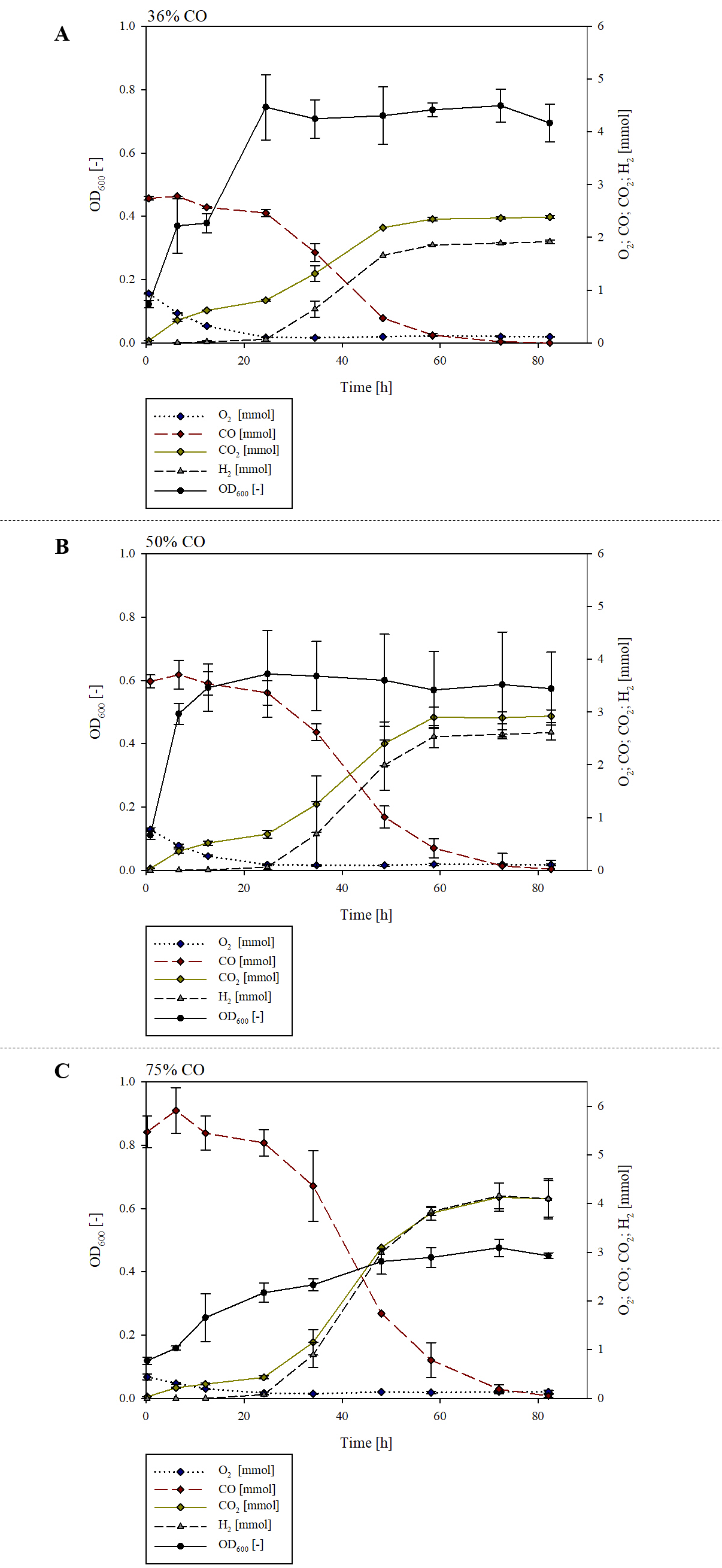 DSM 6285 with an initial gas atmosphere of (A) 36% CO + 64% air (B)