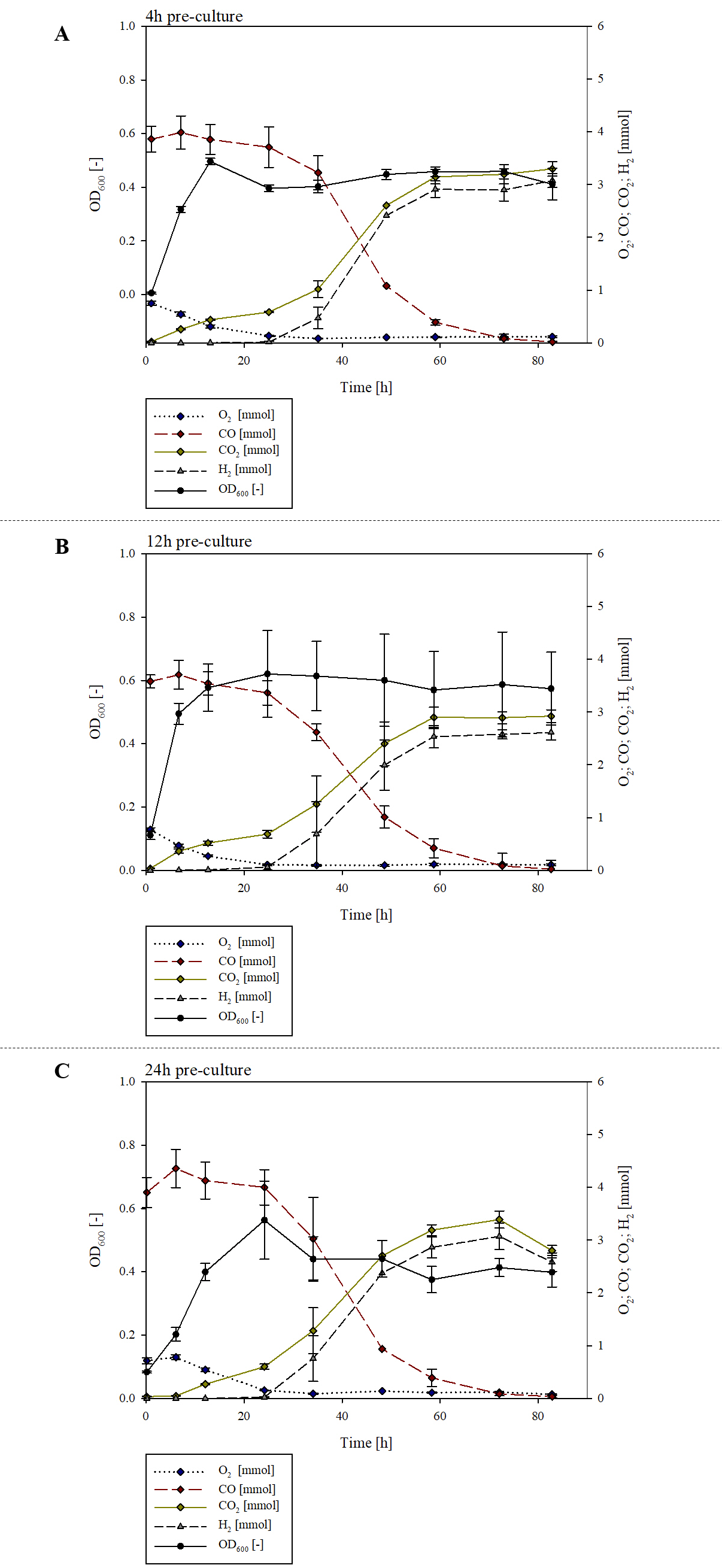 Additional file 3. Effect of inoculum preparation on H2 production— incubation time of the 2nd pre-culture. OD600 and gas composition during the cultivation of P. thermoglucosidasius DSM 6285 with variations in the incubation time of the 2nd pre-culture: (A) 4 h (B) 12 h (C) 24 h.