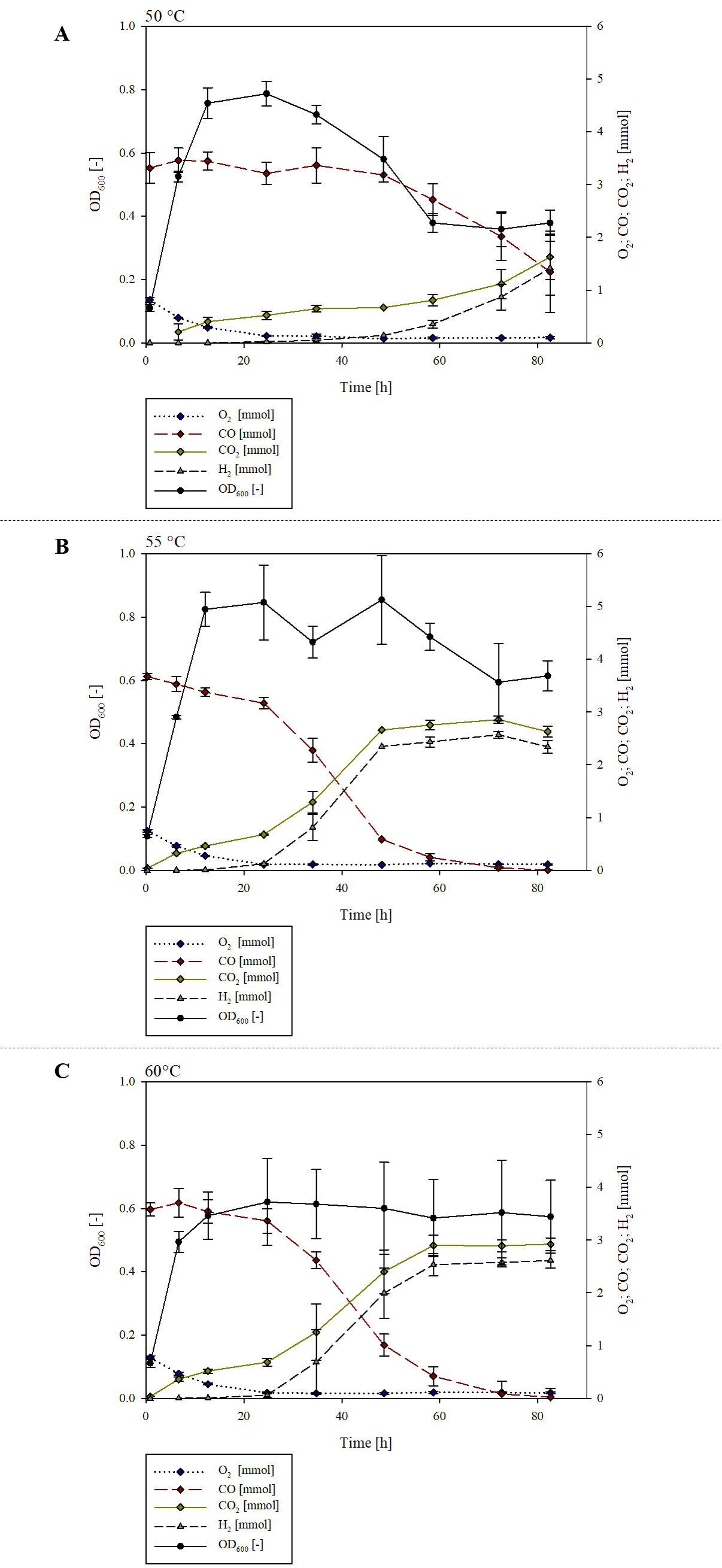 Additional file 4. Effect of cultivation temperature on H2 production. OD600 and gas composition during the cultivation of P. thermoglucosidasius DSM 6285 with different cultivation temperatures: (A) 50 °C (B) 55 °C (C) 60 °C.