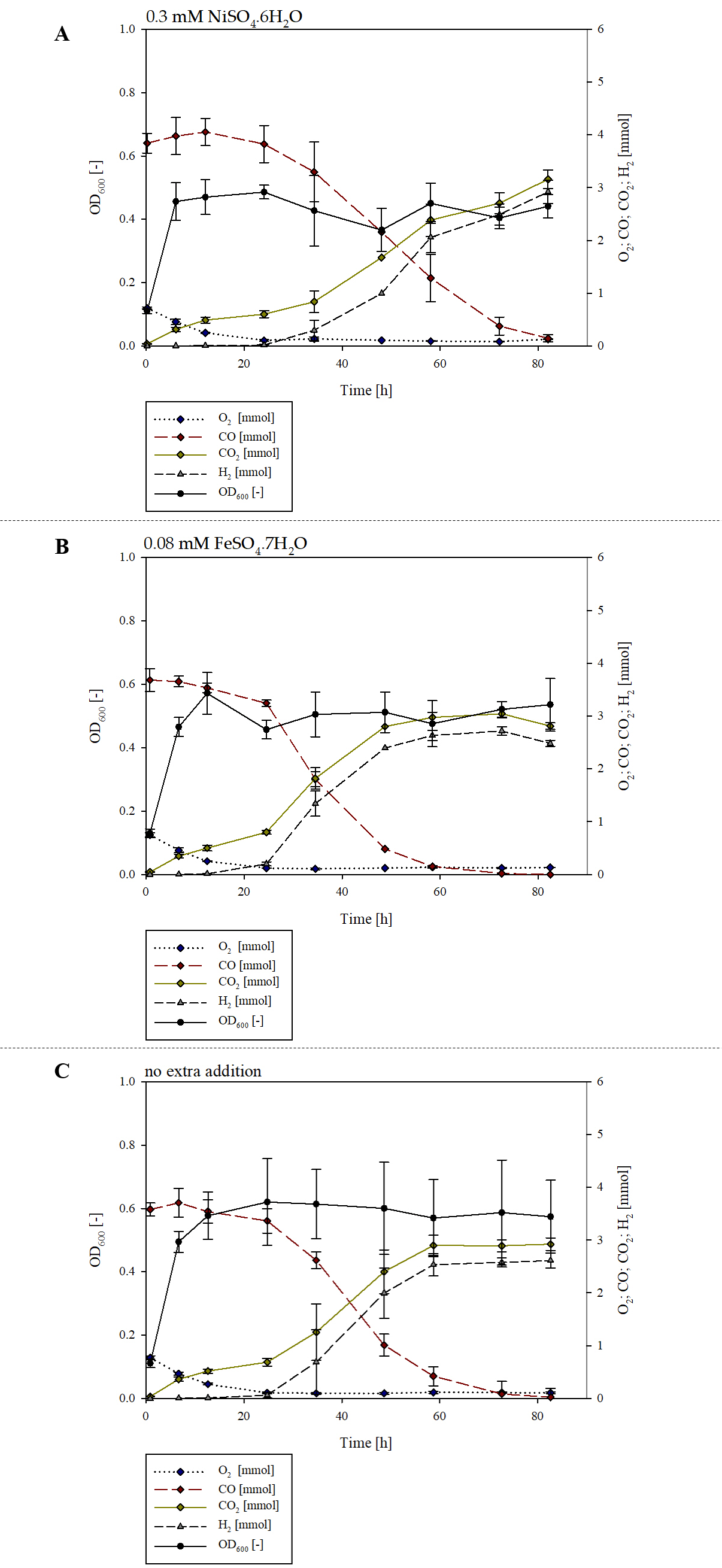 Additional file 6. Effect of Nickel and Iron concentration on H2 production. OD600 and gas composition during the cultivation of P. thermoglucosidasius DSM 6285 with addition of trace elements: (A) 0.3 mM NiSO4 ·6H2O + 0.04 mM FeSO4 ·7H2O and (B) 0.080 mM FeSO4·7H2O (C) 0.04 mM FeSO4 ·7H2O.
