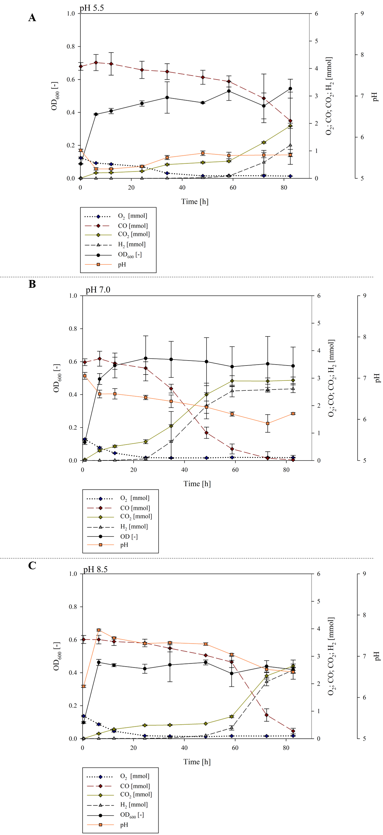 Additional file 5. Effect of initial pH on H2 production. OD600 and gas composition during the cultivation of P. thermoglucosidasius DSM 6285 with different pH set ups: (A) pH 5.5 (B) pH 7.0 (C) pH 8.5.