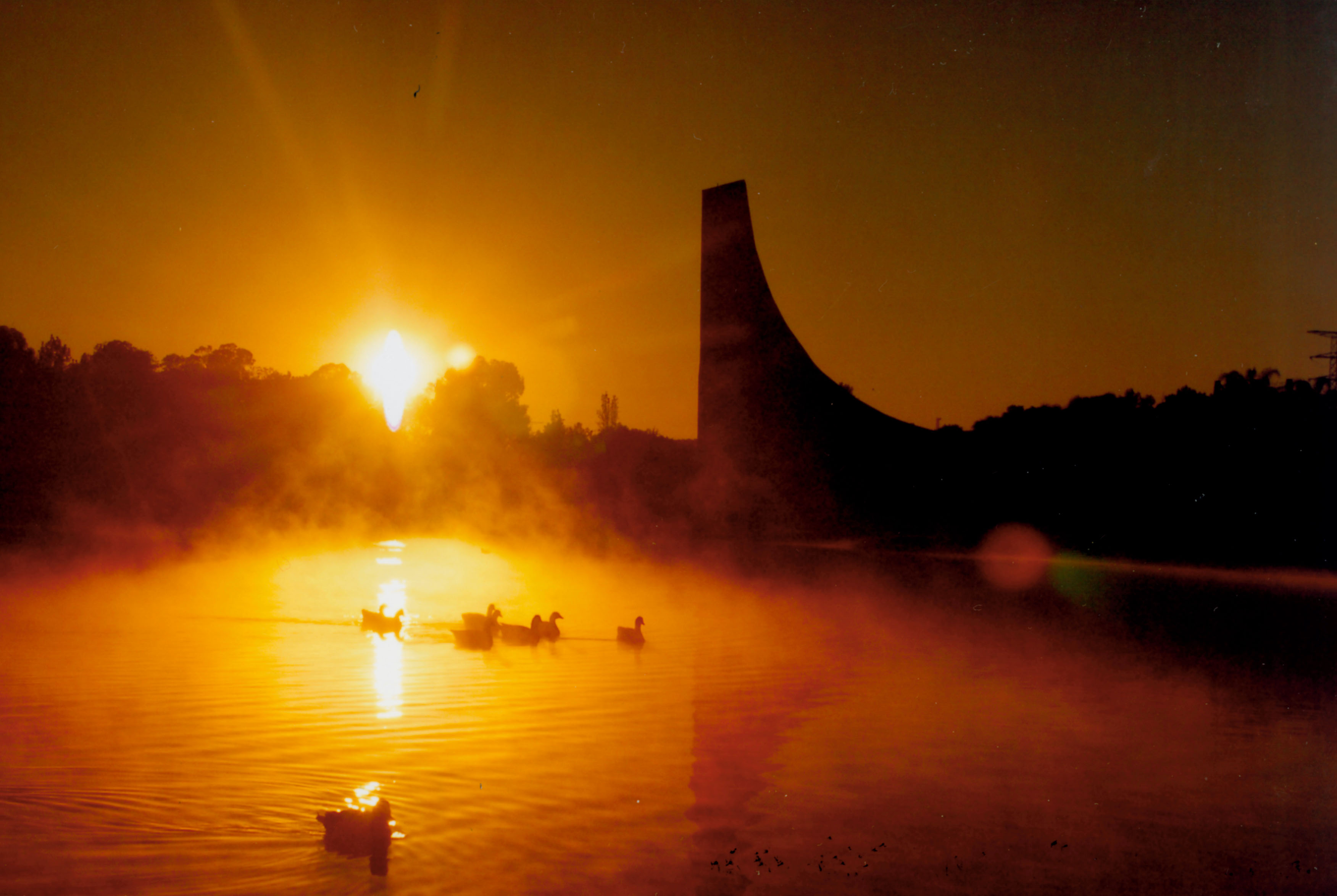Distant front view of the Indoor Sports Centre with a sunset and a badling of ducks swimming, LC de Villiers Campus, University of Pretoria.