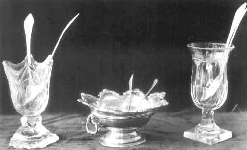 Photograph depicting two cut-glass vessels - their use undetermined - and one silver bowl, probably a bonbonniere or sweetmeat-box, all from the Koopmans Collection. Several spoons can also be seen resting in each.