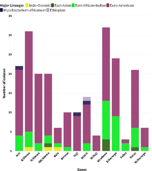 INTRODUCTION : The population structure of Mycobacterium tuberculosis complex (MTBC) in Ethiopia is diverse but dominated by Euro-American (Lineage 4) and East-African-Indian (Lineage 3) lineages. The objective of this study was to describe the genetic diversity of MTBC isolates in Central, Eastern and Southeastern Ethiopia.