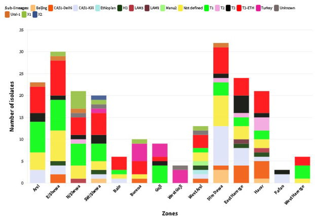 RESULTS : Six major lineages: Euro-American (Lineage 4), East-African-Indian (Lineage 3), East Asian (Lineage 2), Indo-Oceanic (Lineage 1), Mycobacterium africanum (Lineage 5 and Lineage 6) and Ethiopian (Lineage 7) were identified. The majority (94.6 %) of the isolates were Euro-American and East-African-Indian, with proportions of 75.3 % and 19.3 %, respectively. Overall, 77 different spoligotype patterns were identified of which 42 were registered in the SITVIT2 database. Of these, 27 spoligotypes were unique, while 15 were clustered with 2–49 isolates. SIT149/T3_ETH (n = 49), SIT53/T1 (n = 33), SIT21/CAS1_Kili (n = 24) and SIT41/Turkey (n = 11) were the dominant spoligotypes. A rare Beijing spoligotype pattern, SIT541, has also been