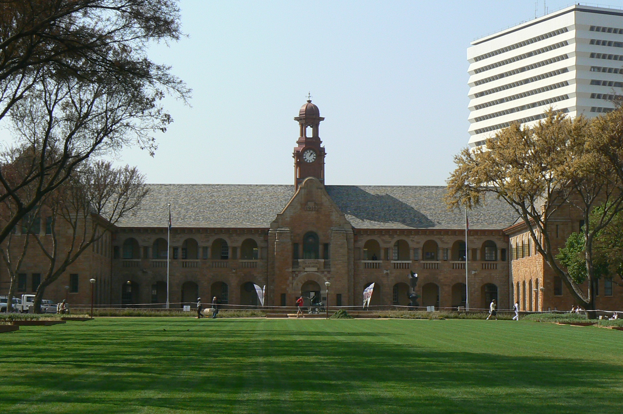 The beautiful sandstone building with its clock tower, Oregon pine floors and slate staircases was the first building to be completed on the campus of what was then the Transvaal University College (TUC). The foundation stone was laid on 3 August 1910. At the opening in August 1911, General Jan Smuts expressed the hope that the TUC would one day be to this country what Oxford was to England. Today, the staircase still features an exquisite stained glass window of the original TUC coat of arms. Designed by a student of Sir Herbert Baker, Percy Eagle, the building boasts different styles including elements of Cape Dutch and Neo-Romanesque. In recognition of its beautiful architectural style, the building was proclaimed a National Monument in 1968. The fountain in front of the building was redesigned in 1990 with two red lechwes (antelopes) sculpted by Coert Steynberg and sponsored by Dr Anton Rupert and his wife. Initially the building housed almost the entire University. Today it accommodates the UP Archives, Department of UP Arts, Mapungubwe Museum and the Van Tilburg collection.