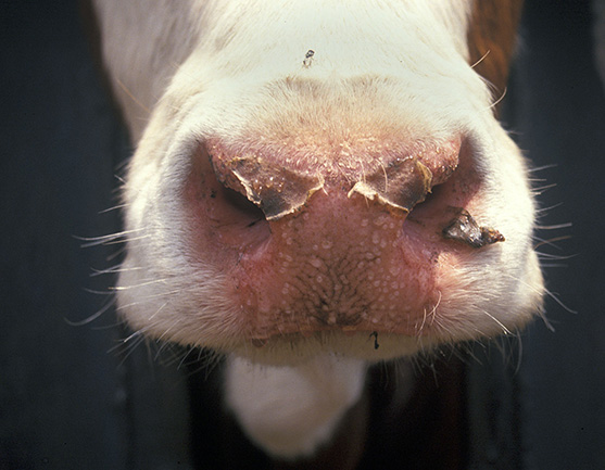Chronic bluetongue in a bovine showing crusty lesions on the muzzle