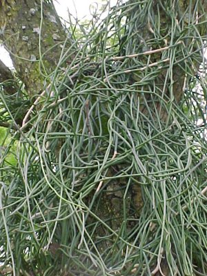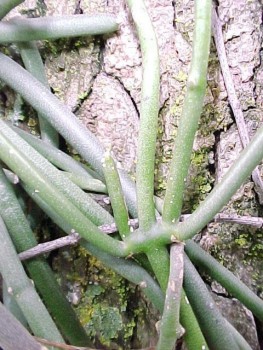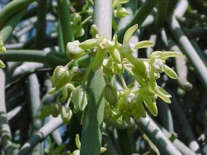 BOTANICAL DESCRIPTION: General: This is a sturdy, succulent, vigorous climber (can be shrub-like) which grows in and over trees and other shrubs, sometimes smothering the supporting plant. The lower part of the stem has a thick corky bark. The grey-green branches are pencil-shaped, usually ± 5 - 10 mm in diameter. White latex appears when the plant is damaged. Leaves: No leaves Flowers: Star-shaped, creamy-white to yellow and sweet smelling. In clusters at the nodes. Fruit: The fruit resembles a pair of horns. The flat seeds have each a plume of stiff hairs.