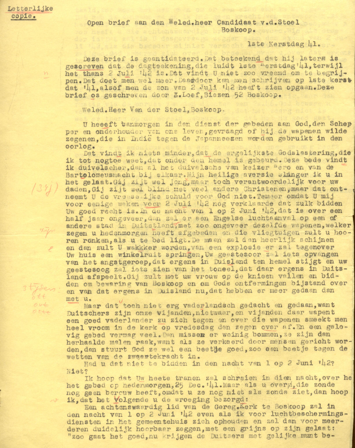 Letter to Van der Stoel to complain about a prayer he did in a sermon about the India and Japanese crisis