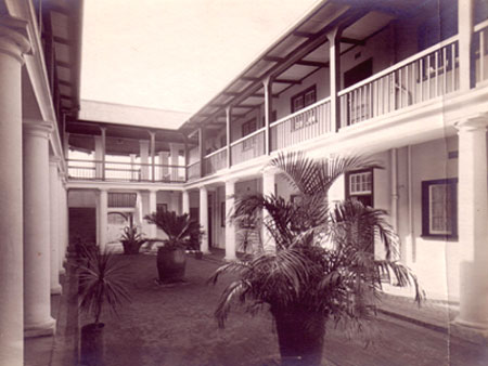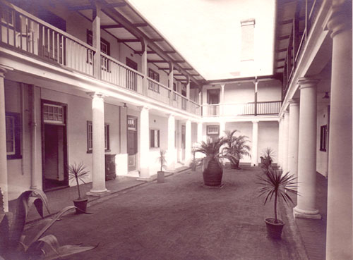 From the Pearse Collection: two photographs depicting a courtyard of a two-storey building, probably residential and dating from the 19th century. Doric columns support a walkway with wooden columns and balustrade, and a corrugated iron roof.