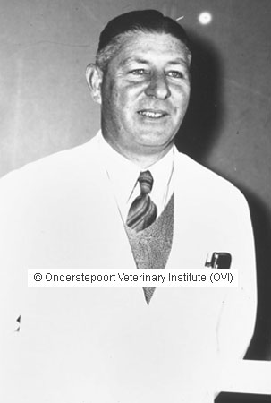 Black/white photo. Original document size: (w)4.71 x (h)7 cm. Original scanned size: 109 kb JPEG, 600 dpi. Final web-ready size: 16.96 kb. Estimate download time: 7 sec. @ 28.8 kbps. Original TIFF file housed at the Dept. Veterinary Tropical Diseases, University of Pretoria. Metadata assigned by Prof. R.C. Tustin, Professor Emeritus: DVTD. His academic and professional experience includes: veterinarian for 54 years,