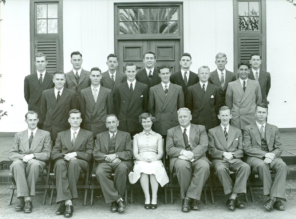 The names of the graduates and staff on the photo are Front (from left to right): CL Craig, PA Basson, Prof PJ Fourie, MMS Smuts, Prof WO Neitz, PN Collier, CJ Howell ; Second row: TW Naudé, DJ le Roux, JR Philip, PJS Anderson, DC Wright, ANS Abrey ; Third row: ZP Kempster, HDP Dames, R Wege, L Black, L van Wyk, PJNR Bisschop, AJD Williamson. More information on some of the veterinarians can be read in: Past veterinarians in South Africa / Posthumus, P.J. URL: http://hdl.handle.net/2263/21238