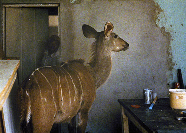 Rabies in a kudu in Namibia : the animal tries to enter the shelter of an individual