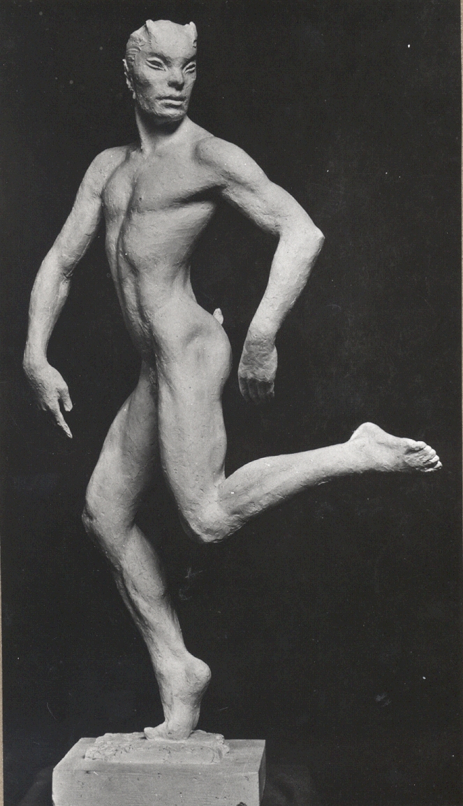 This work of a performing satyr is part of a set along with the work titled Strauss’ Serenade (1924). Willie Grobler, a cousin and long-time friend of Eloff posed as the dancing figure. Dancing Satyr was sold in France, it is not established if the work was ever cast in bronze and its whereabouts remain unknown.