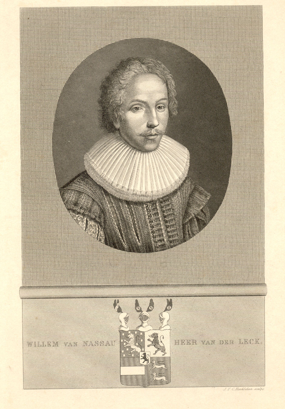 Willem van Nassau (1601-1627), heer van Leck was the grandson van Willem of Oranje (1533-1584). Prince Mauritz (1567-1625) was his father but was never married to his mother Margaretha van Mechelen, who was a distant cousin. Because of this connection Willem becomes a high functionary in the state military