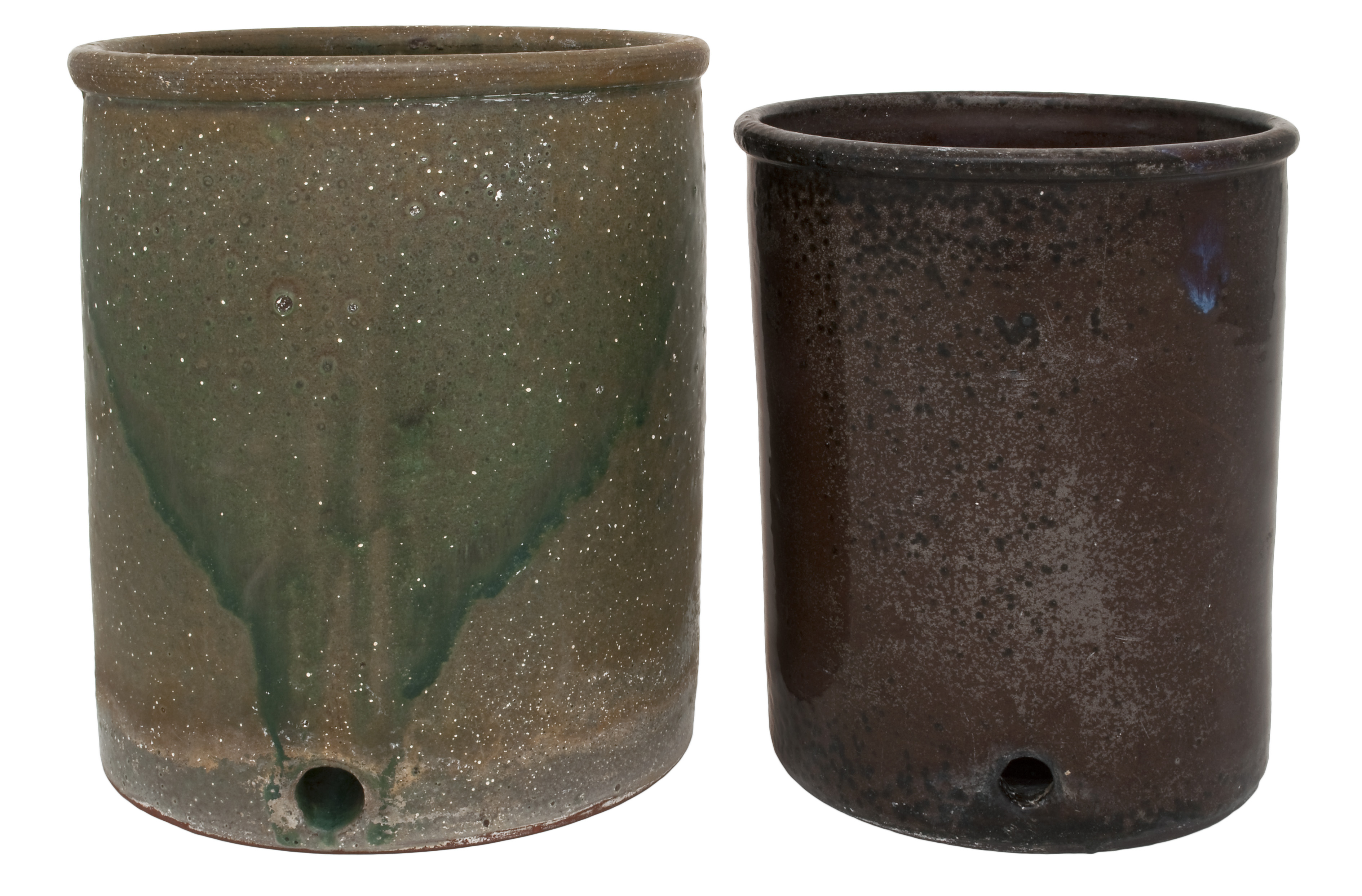 Two round cylindrical lead-glazed earthenware pots, one in a green glaze and the other in a brown glaze. Both pots are marked “Globe” on the bottom. The Globe pottery was situated in Muckleneuk in Pretoria and was Pretoria’s first Pottery. The Department of Plant Science of the University of Pretoria commissioned these pots as planters in 1922.
