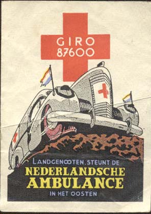 Stamp, “Giro 87600 Landgenooten, steunt de Nederlandsche Ambulance in het Oosten”. With ambulance car, red cross and two Dutch flags. Original size 70mm x 50mm.