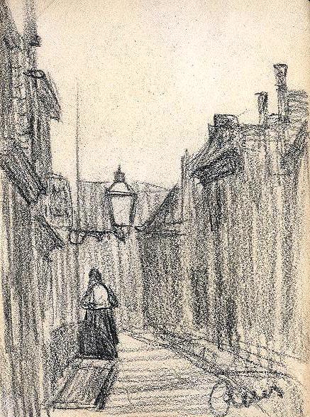 The charcoal sketch by Reus is that of a woman in an alleyway. Woman slightly to the left with a large lamp hanging above her head and a porch behind her.