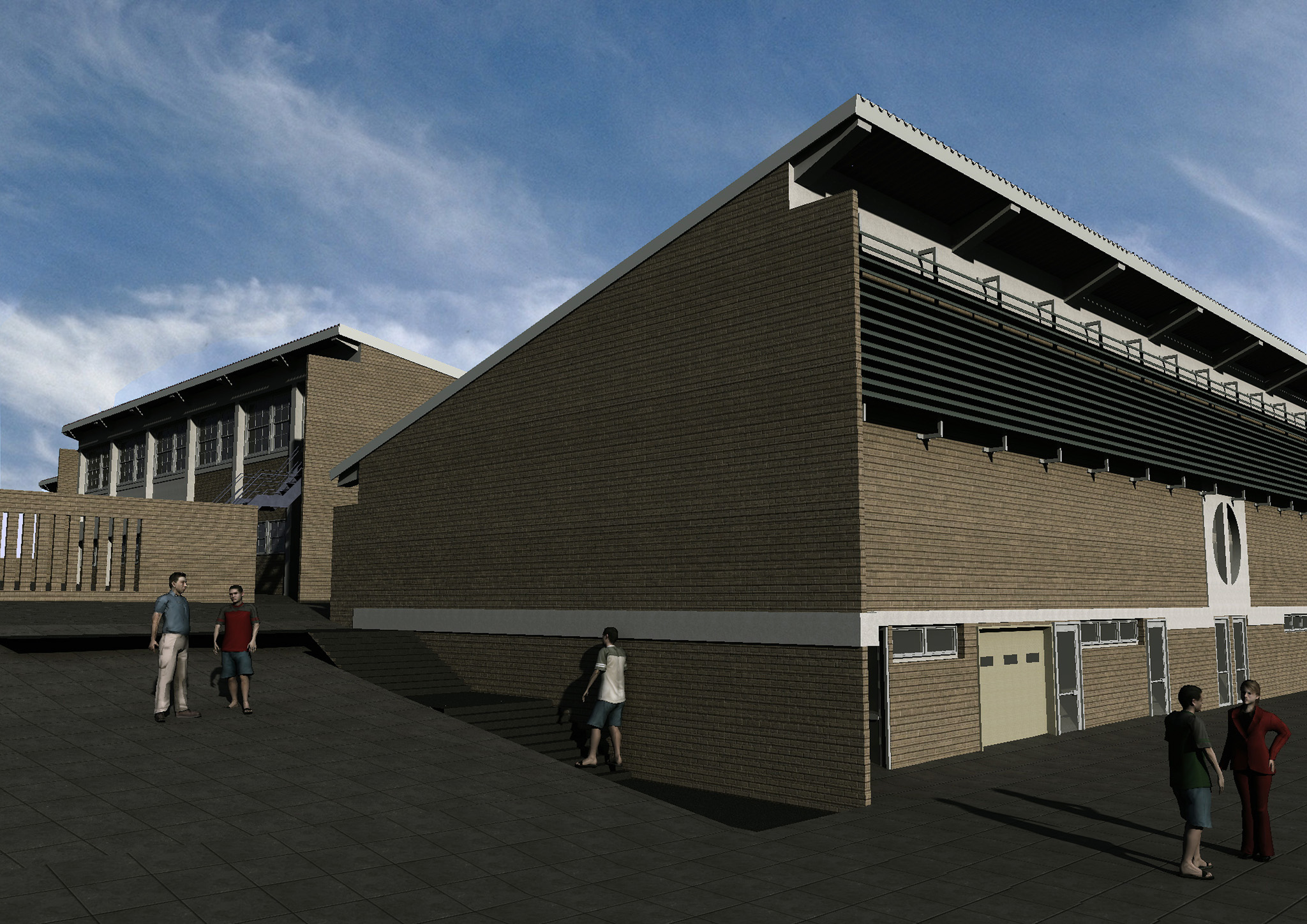 This brown-yellow face-brick building shows influences of the simple Modern style and is typical of Pretoria brick architecture. Built during the war years for the newly established Department of Physical Education, the building was officially opened on 8 October 1948. Because of wartime restrictions, material and building costs had to be kept to a minimum and the planned swimming pool and locker rooms never materialised. Locker rooms were added in 1952 and in 1974 a larger wing was added. The building originally consisted of two gymnastic halls, lecture halls and offices. In 1982 Physical Education relocated to the newly constructed Sports Centre. The building is currently the home of the Department of Visual Arts and regularly hosts art exhibitions.