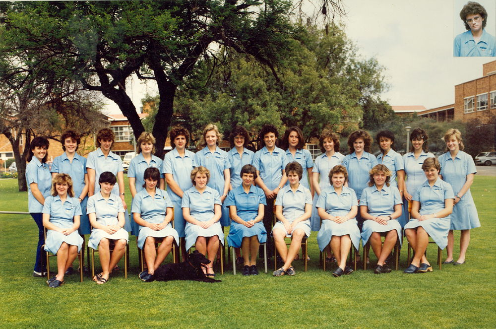 Formal colour photo taken outdoors of the 1986 DVN class with Dr Ingrid Wolleschak and their class mascot dog Lopatol. The names of the veterinary nurses on the photo are: Front (from left to right): A Viviers, CG Little, MS Sloane, CA Molloy (Class Captain), Dr I Wolleschak, B Odendaal, M le Roux, JM McGregor, L Lötter ; Second row: J Carmichael, E van der Jerwe, JF McMillan, HC Combrink, D Vorster, S Wyberneit, S Burton, DM Tuinder, SE Kriel, CA Hutchison, LJ Lenner, MJ Jansen van Vuuren, MJ van Schalkwyk, D Jarvis ; Insert: G Lessing ; Lying in front: Lopatol (Class Mascot)