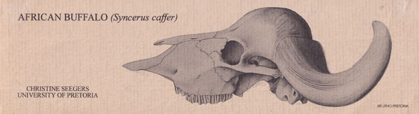 Postcard and bookmark created for the Veterinary Science Library to promote services and operating hours. The artwork of the African buffalo is from Christine Seegers, one of the few biomedical artists in South Africa. She made a large collection of biomedical illustrations of wild and domestic animals while she was employed in the Department of Anatomy of the Faculty of Veterinary Science, Onderstepoort from 1969/10/01 - 1999/10/01