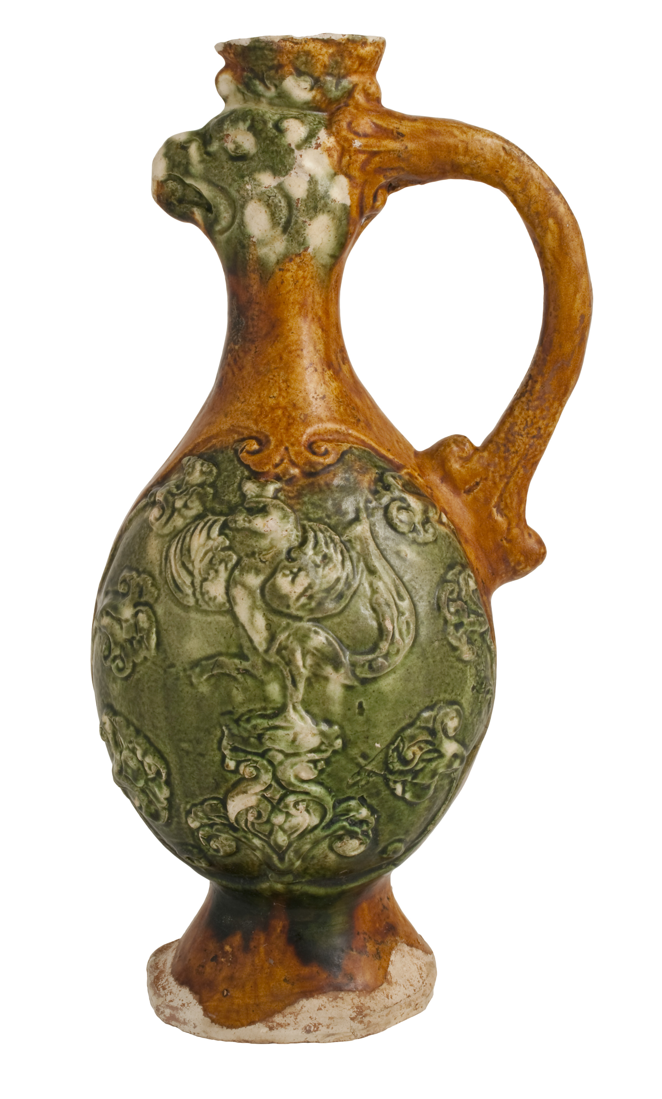 This sancai-glazed phoenix-head ewer was derived from West-Asian metal vessels, which were imitated and adapted by lead-glazing potters of China. It has a moulded relief panel on each side, the one showing a mounted horseman and the other a fêng huang (phoenix) surrounded by floral motifs. The buff earthenware ewer is covered with a three-colour (sancai) lead glaze in the regular fashion of funerary vessels. It was made in two vertical halves, each half incorporating decoration and slightly flattened in body of oval section. These two parts were luted together so that the joint ran vertically up to the neck and spout. The handle moulded into vegetable sprouts at either end is a characteristic particular to this type. The spout, in phoenix-head shape, is blind, the only opening being at the top of the vessel. It seems that because vessels of this kind were made for tombs proper, pouring spouts were considered immaterial. The beak holds a pearl and the lip of the vessel is elaborately moulded to represent the phoenix’s crest.