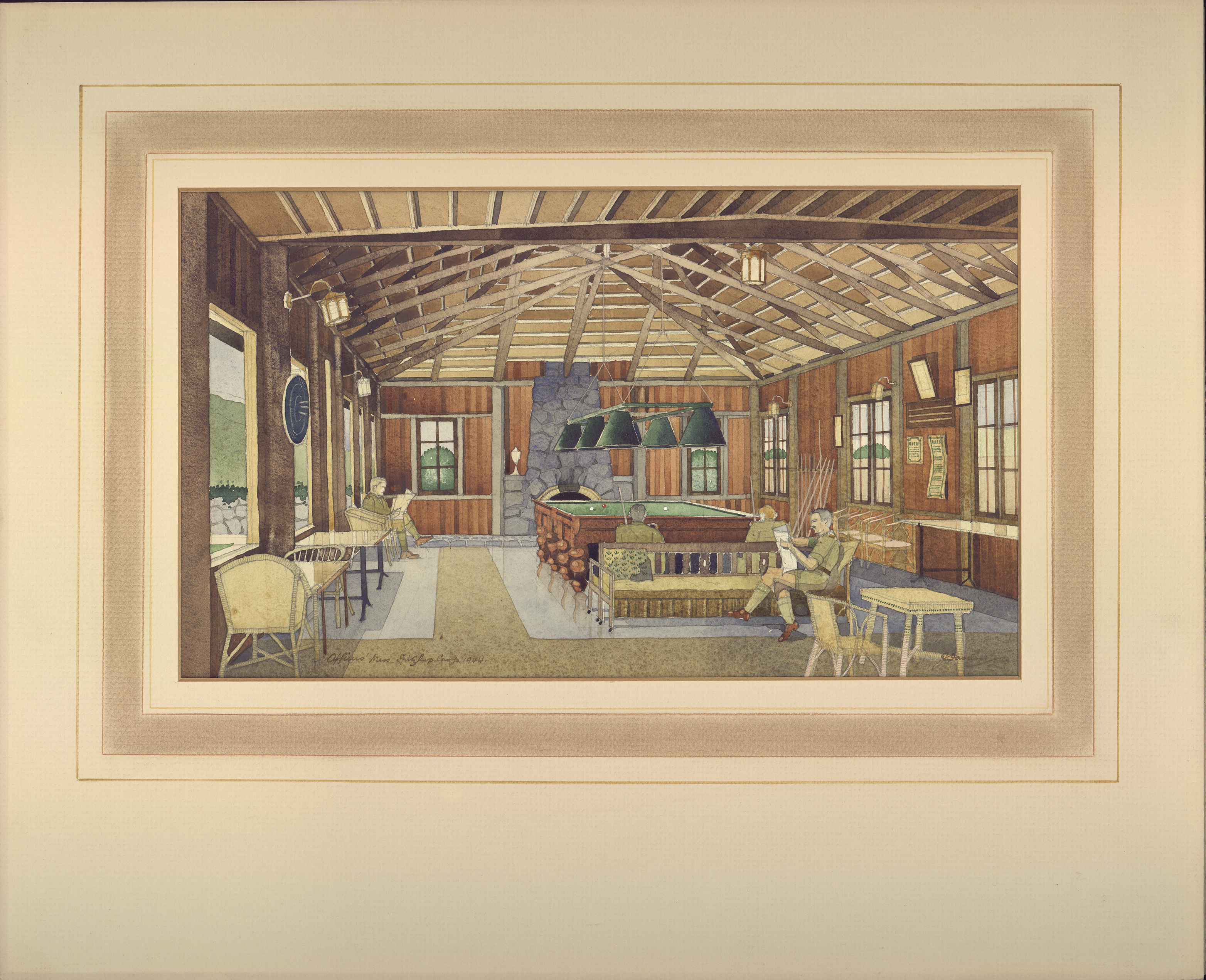 An interior perspective of the officer's mess at Spitzkop, the training base of the University of the Witwaterand's engineering corps where John Fassler spent time in preparation for joining the second world war. Techniques in camouflage - the specialty in which he trained - changed and while retraining, the war ended.