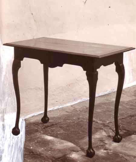 Photograph depicting a small mid 18th century table at Koopmans De Wet House in Cape Town. Its slender cabriole legs terminate in claw and ball feet. The top has a border of dark wood, and the apron is shaped. See also pages 73 and 76 of the 1960 edition of prof. Geoffrey Pearse's book "Eighteenth Century Furniture in South Africa".