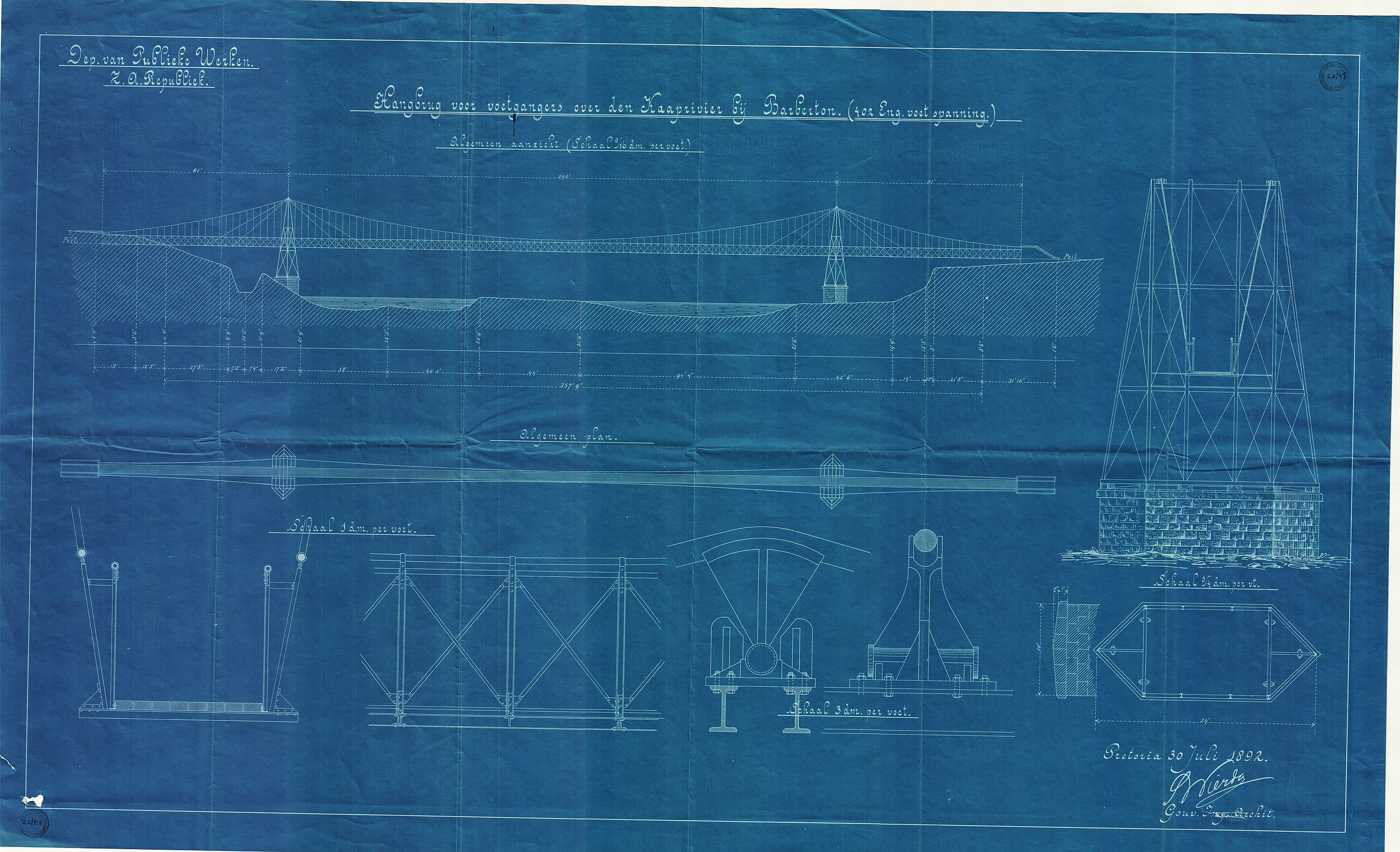 Digitised version of National Archive file S.2/77. Plan of a suspension bridge for pedestrians, Kaap River, Barberton, signed by "S.W. Wierda, Hoofd, Dept. van Publieke Werken"