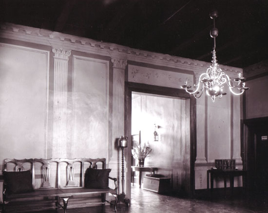 From the Pearse Collection: photograph of the inner hall of Koopmans de Wet House, showing painted walls depicting a trompe l'oeil entablature and pilasters. A six-legged Queen Anne style settee (rusbank) with rattan seat, back splats and cabriole legs is displayed, and from the ceiling hangs a brass chandelier. Through the door a kist with sloping sides and a half-moon table with tapered legs can be seen. Photograph probably considered for prof. Geoffrey Pearse's book "Eighteenth Century Furniture in South Africa", but never included.