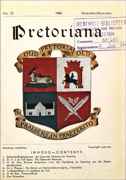An open-air museum for Pretoria -- An association Old Benoni? -- The open-air museum / F.J. du Toit Spies -- The Netherlands open-air museum -- Diverse gegewens i.v.m. die oprigting en opening van die Staats-modelskool / H.M. Rex -- Die skerm- en gimnastiekvereniging Transvalia / J. Ploeger -- Pretoriuskloof / H.M. Rex -- 'n Gedenksteen vir landdros Du Toit -- Die grafsteen van Graaf Pretorius