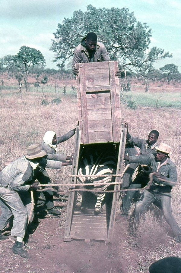 Releasing a Burchell's zebra from a single crate, Kruger National Park, South Africa - August 1980
