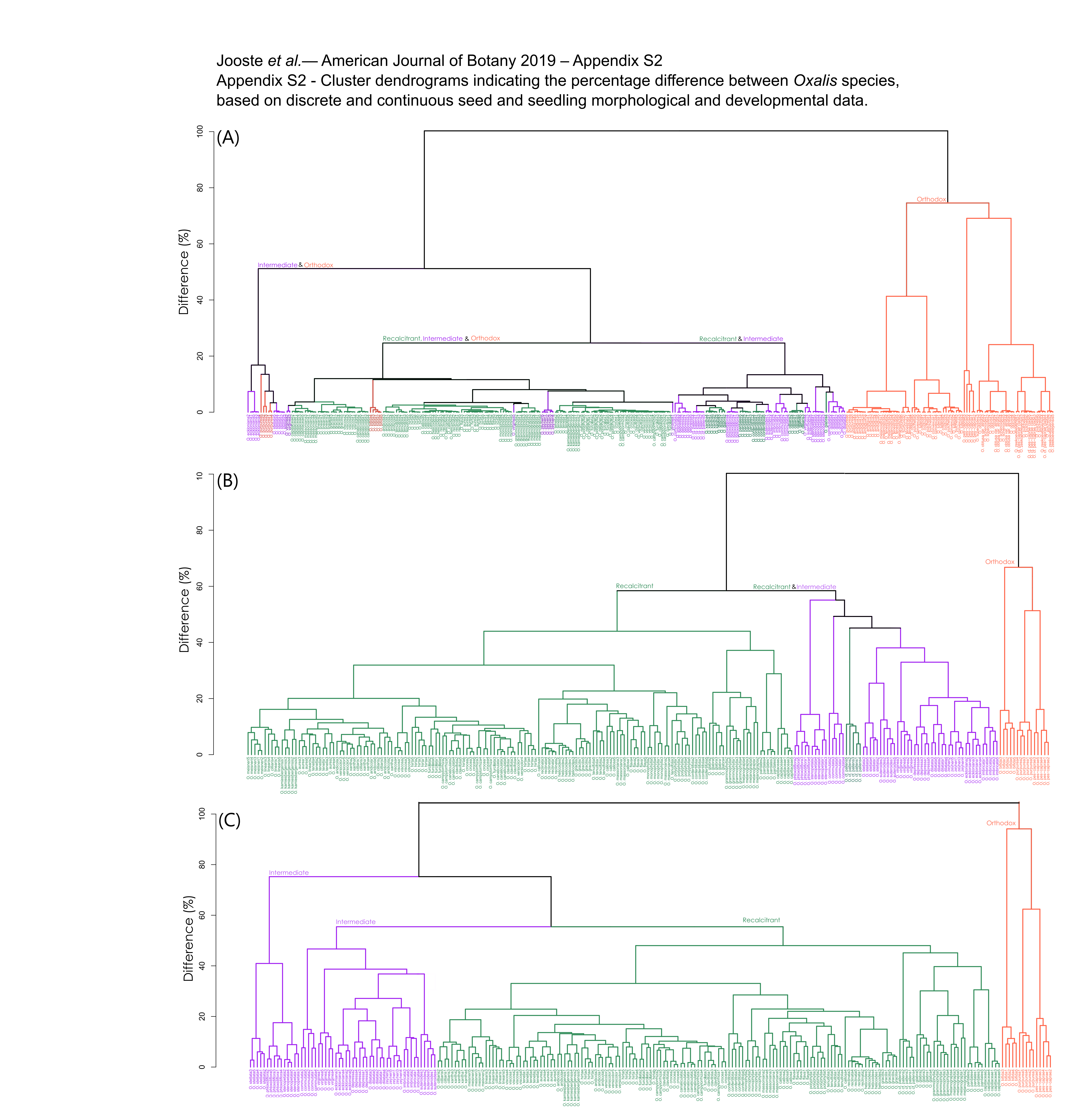| dc.description | Appendix S2. Cluster dendrograms indicating the percentage difference between Oxalis species, based on discrete and continuous seed and seedling morphological and developmental data. Data from the seed (A), seedling (B), and combined seed‐and‐seedling (C) data set were analyzed. The majority of replicates per species cluster together coherently. Cluster analyses revealed coherent clustering of data into at least three (or four) clusters, supporting three germination strategies. | en_ZA |